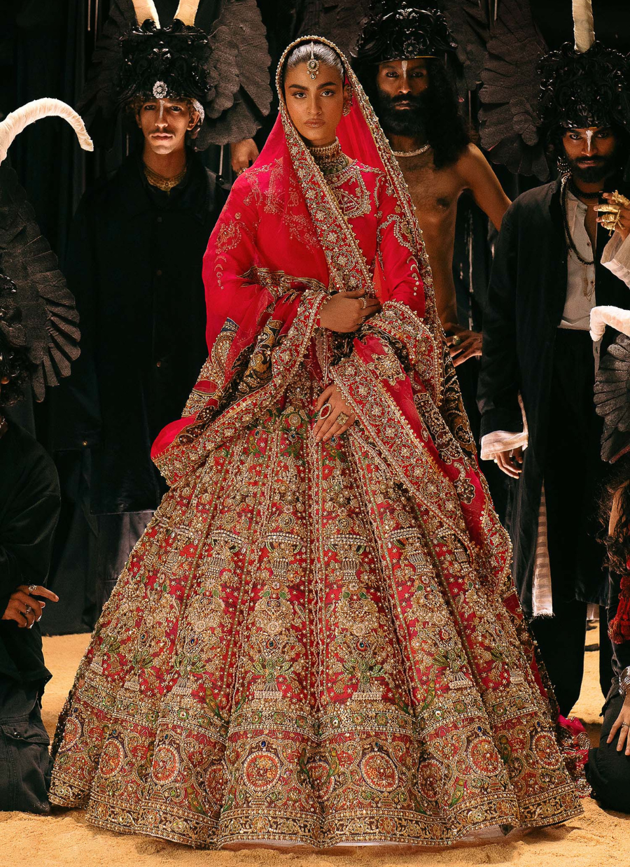 A regal crimson red bridal lehenga featuring exquisite hand embroidery in resham, zari, sequins, and dabka, forming intricate floral and geometric patterns across the voluminous skirt. The full-sleeved blouse is richly embellished to complement the grandeur of the lehenga, while the dupatta is finished with detailed borders and ornate craftsmanship. This ensemble radiates opulence and tradition, making it the perfect choice for brides seeking a bold, timeless, and majestic wedding look.