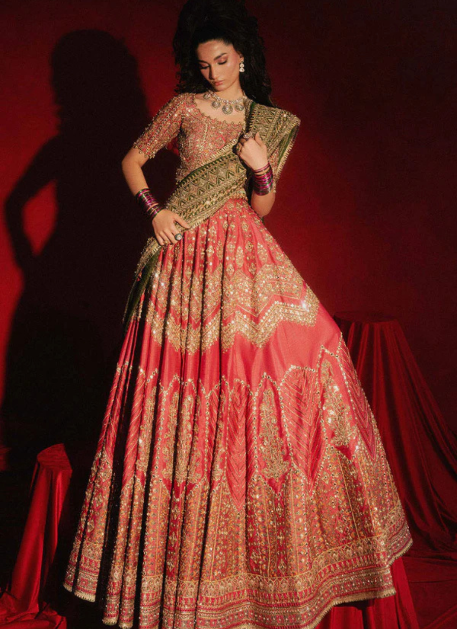 Romantic and regal, Gul Badan is a rose pink Indian silk creation that blooms with Mughal-inspired artistry. The short choli, with modest half sleeves, is delicately dusted with mirror work and fine metallic embroidery. The lehenga begins with chevron detailing at the waist, opening into diamond-shaped panels, each adorned with floral motifs in silken thread, block print, and twinkling mirrors. Beneath this garden of geometry, vertical embroidered scrolls rise like antique architectural vines, while the hem is wrapped in layered embroidered borders reminiscent of vintage sari pallus. A contrasting organza dupatta in lush green elevates the look with bold floral Mughal motifs in gota and adda work, edged with broad gold borders and embroidered trims. Gul Badan is a vision of old-world romance and timeless craftsmanship, designed for the bride who seeks heritage with elegance.